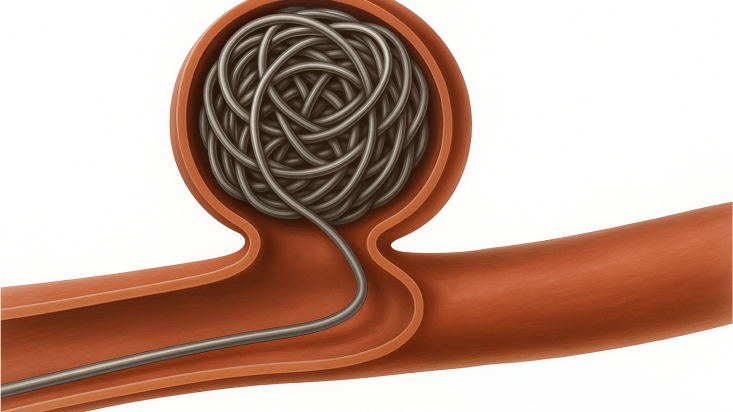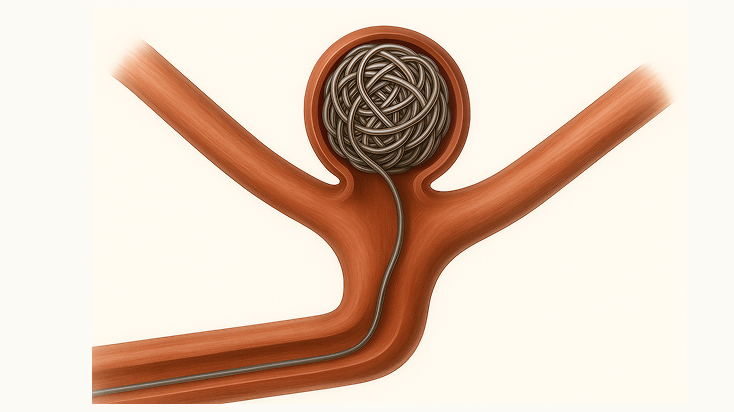 足の付け根や手首の血管から細い管(カテーテル)を脳の血管まで挿入し、プラチナ製のコイルや金属メッシュのステントを使って動脈瘤内の血流を遮断する方法です。頭を開けずに治療できるため、身体への負担が少なく、回復が早いのが特長で、大きく分けると以下の3種類の方法があります。