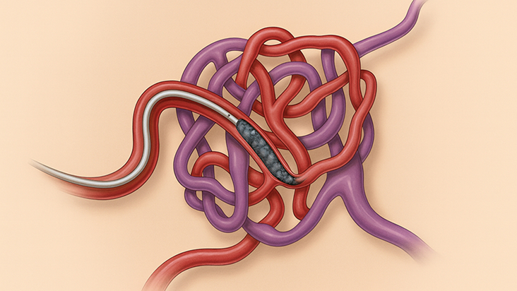 私たちの脳には、酸素や栄養を届ける「動脈」と、使い終えた血液を心臓に戻す「静脈」があります。通常、動脈と静脈は毛細血管を介してつながっていますが、「脳動静脈奇形」では、毛細血管を通らず、動脈と静脈が異常な血管のかたまり(ナイダス)を通じて直接つながっています。